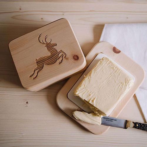 Butterdose aus Zirbenholz mit Hirschmotiv | Servus am Marktplatz