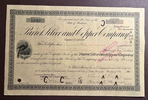 STOCK CERTIFICATE Parrot Silver & Copper Company 1901 Montana...