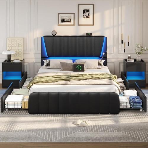Queen Size Bed Frame with 4 Storage Drawers LED Upholstered...