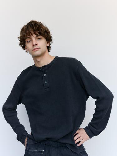 DPTO — Washed Black Cotton Long Sleeve Henley Top