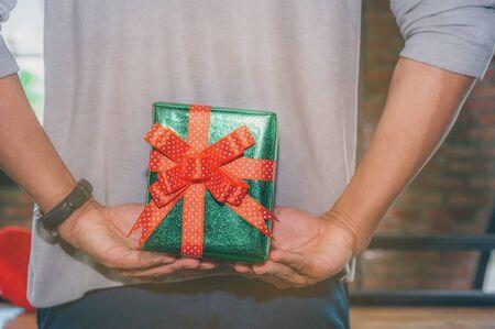 Man Standing And Holding Valentine's Gift Box Behind His Back...