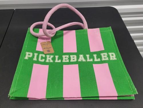 Pickleball Canvas Structured Tote Bag "Pickleballer" Green Pink...