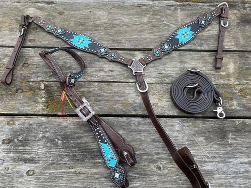 Showman brown Western breast collar/headstall set w/teal...
