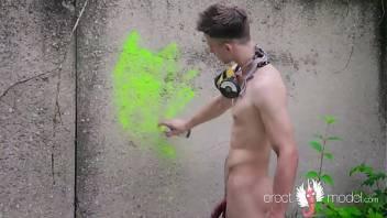 Naked teen boy with soft to hard dick draws bright graffiti...