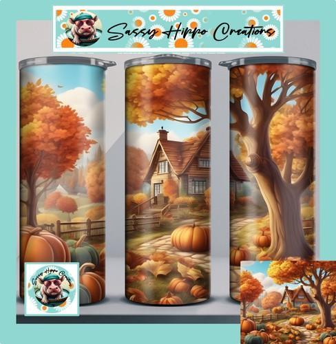 Skinny Tumbler Autumn Cottage Pumpkins Trees Leaves Fall 20oz...