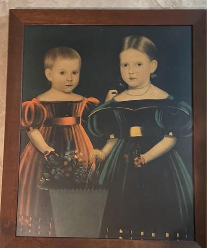 EARLY AMERICAN FOLK ART PAINTING portrait of two girls from He...