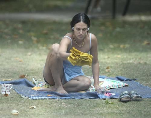 Candice Swanepoel White Pantie Upskirt While Sitting in a Park...
