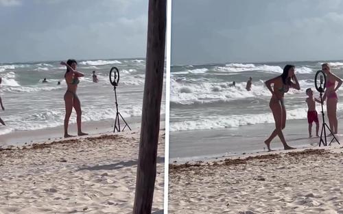 Influencer danst op 't strand terwijl voorbijgangers verbaasd...