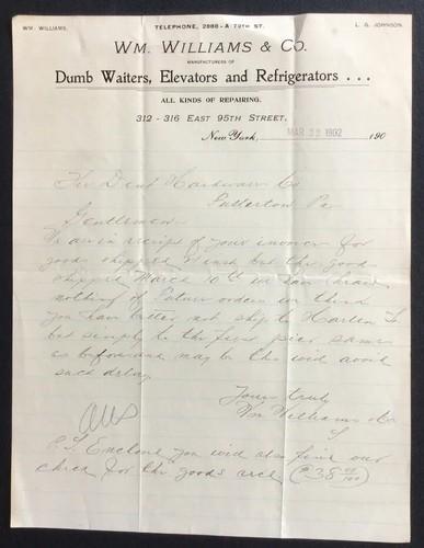 1902 Letterhead New York Wm Williams & Co dumb waiters...
