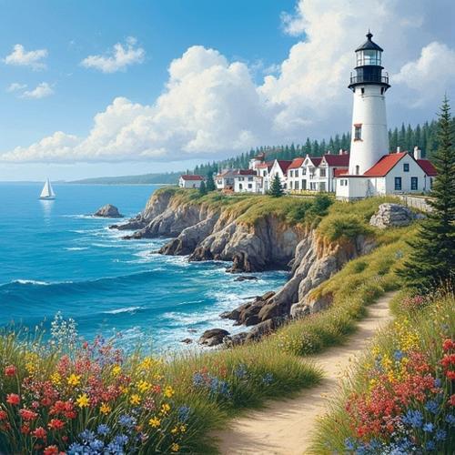 Scenic Coastal City Painting with Lighthouse and Wildflowers in...