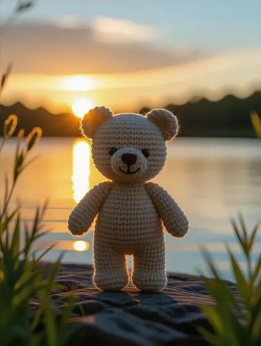 Cute Yarn Bear Figure by Water at Sunset Capturing Peaceful...